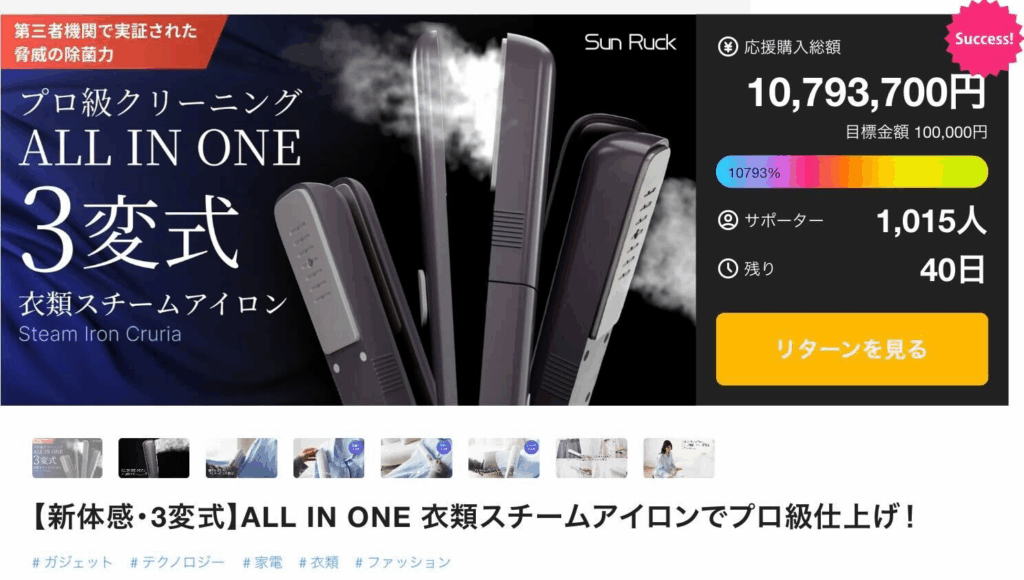 ヘアアイロン型3変式衣類スチームアイロンCruriaは、先行予約販売開始早々に目標を達成、12時間後には応援購入総額1,000万円を突破、目標1万%を達成いたしました。さらに、販売初日にMakuake内3部門のランキングで1位を獲得、3冠を達成しました。※この度、多くの方々にご支援を賜りましたこと、心より感謝を申し上げます。